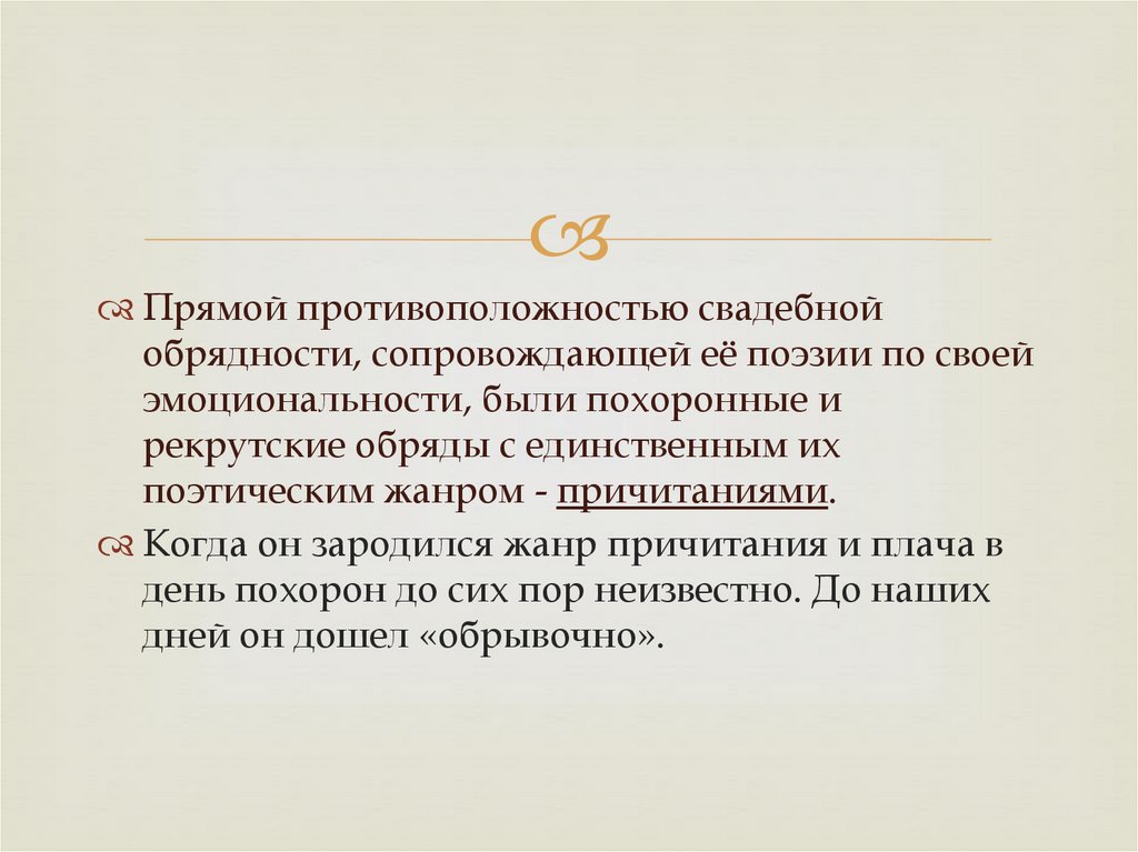 Также большое значение уделяли причитаниям. Они стали