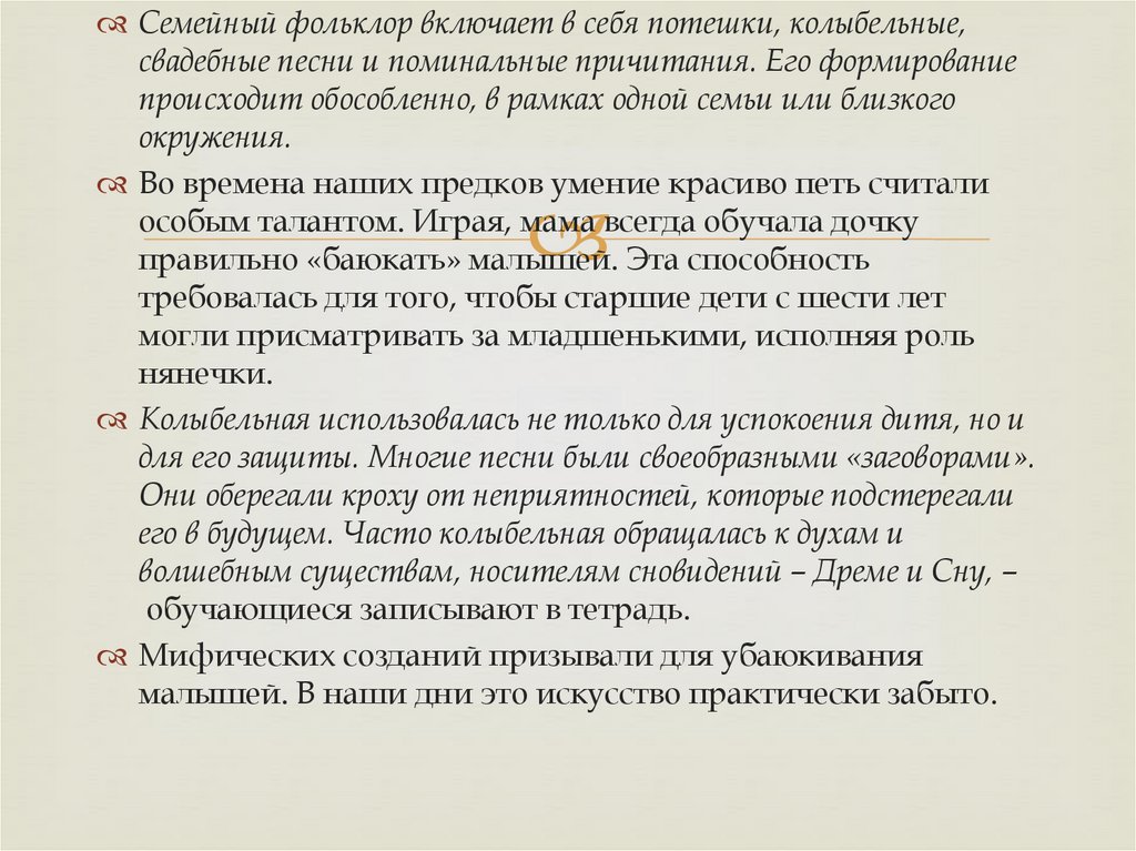 Семейный фольклор включает в себя потешки, колыбельные,свадебные песни и поминальные причитания. Его формирование