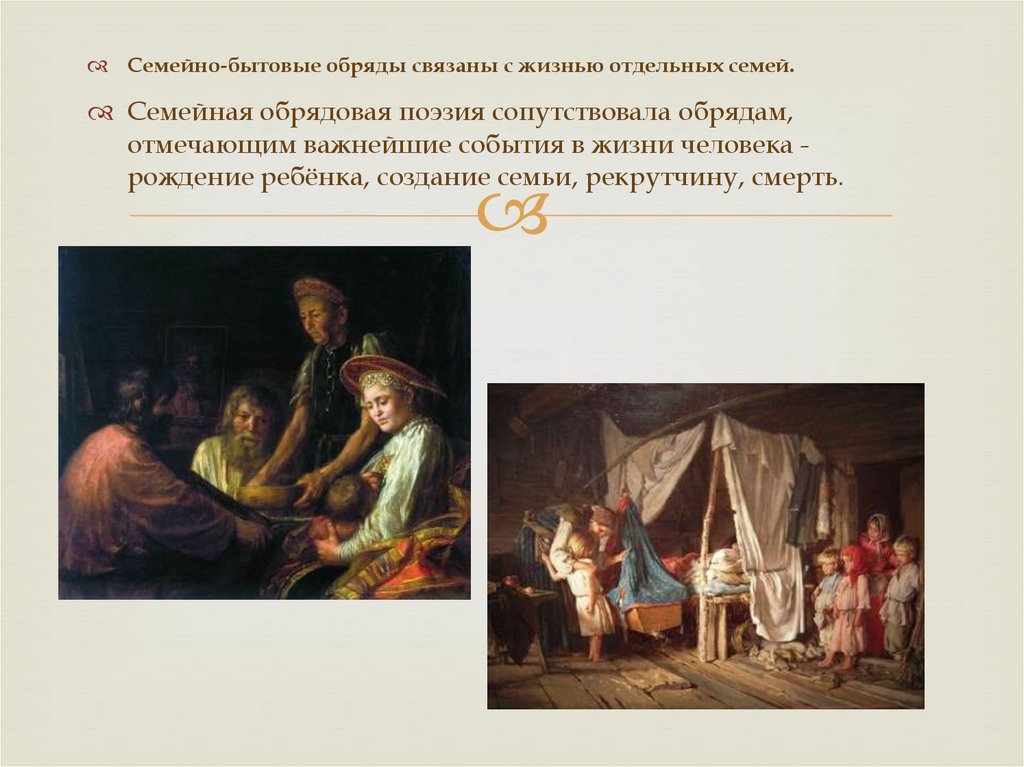 Семейно-бытовые обряды связаны с жизнью отдельных семей.Семейная обрядовая поэзия сопутствовала обрядам,