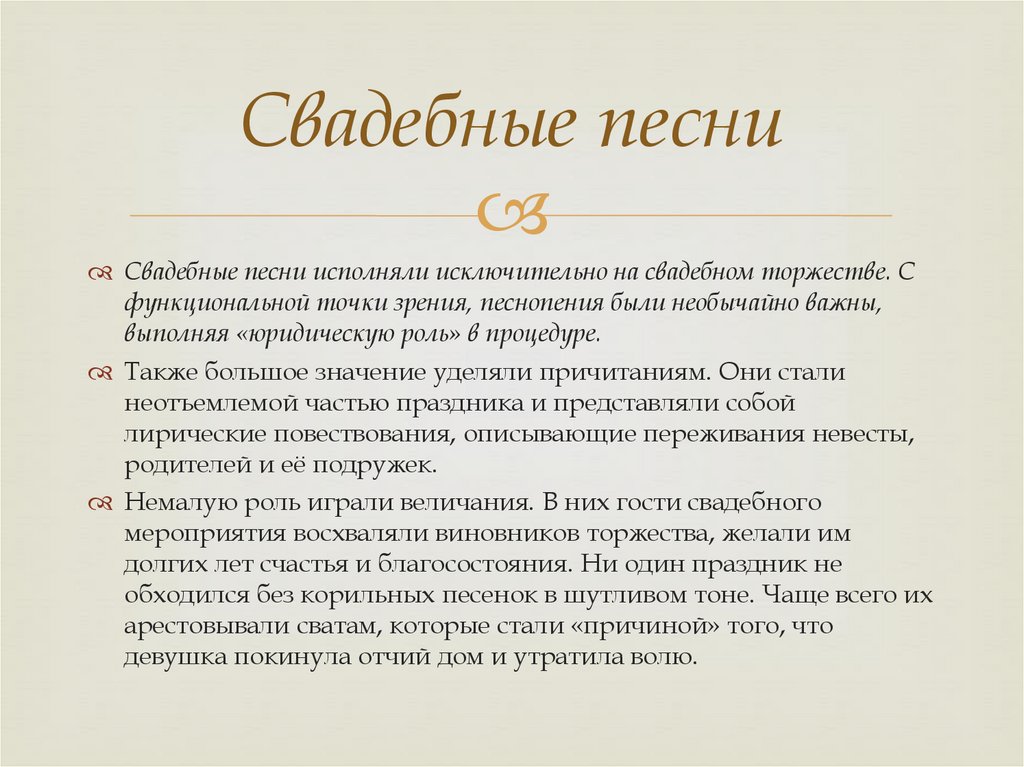 Свадебные песниСвадебные песни исполняли исключительно на свадебном торжестве. С