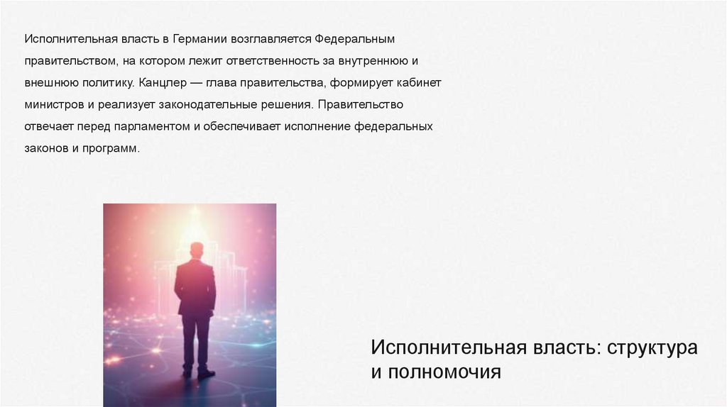 Исполнительная власть в Германии возглавляется Федеральнымправительством, на котором лежит ответственность за внутреннюю и