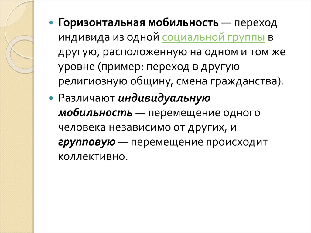 Горизонтальная мобильность — переходиндивида из одной социальной группы в