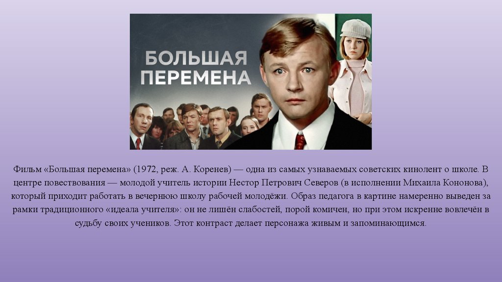 Фильм «Большая перемена» (1972, реж. А. Коренев) — одна из самых узнаваемых советских кинолент о школе. Вцентре повествования — молодой учитель истории Нестор Петрович Северов (в исполнении Михаила Кононова),