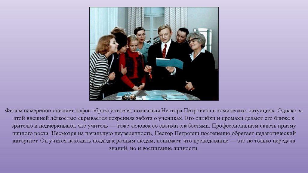 Фильм намеренно снижает пафос образа учителя, показывая Нестора Петровича в комических ситуациях. Однако заэтой внешней лёгкостью скрывается искренняя забота о учениках. Его ошибки и промахи делают его ближе к