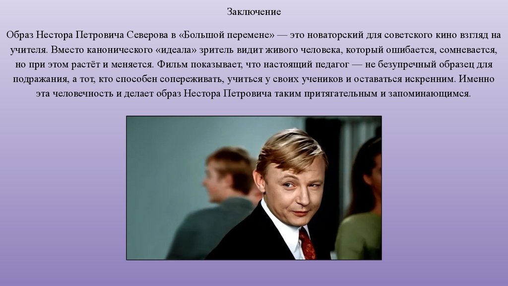 ЗаключениеОбраз Нестора Петровича Северова в «Большой перемене» — это новаторский для советского кино взгляд на