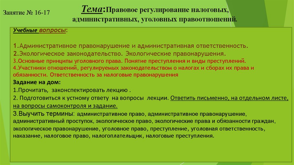 Занятие № 16-17Тема:Правовое регулирование налоговых,