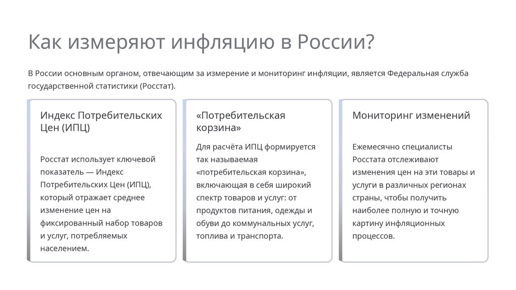 Как измеряют инфляцию в России?В России основным органом, отвечающим за измерение и мониторинг инфляции, является Федеральная служба