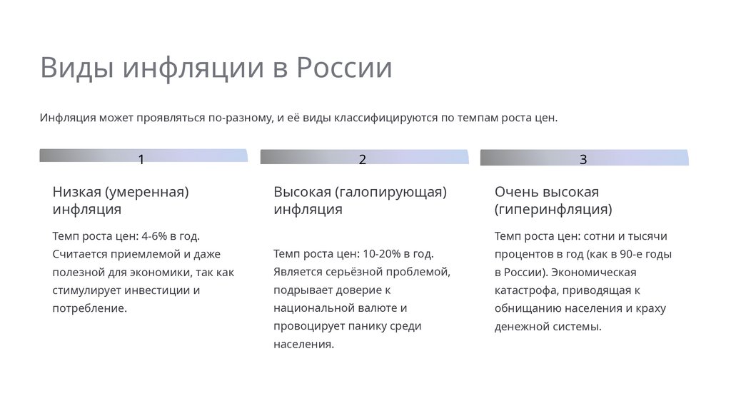 Виды инфляции в РоссииИнфляция может проявляться по-разному, и её виды классифицируются по темпам роста цен.