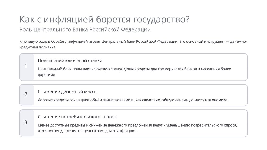 Ключевую роль в борьбе с инфляцией играет Центральный банк Российской Федерации. Его основной инструмент — денежнокредитная политика.