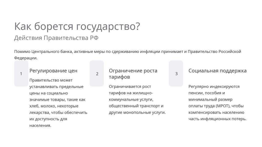 Государство борется с инфляцией, используя ключевую ставку Центрального банка, регулирование цен и тарифов, а также