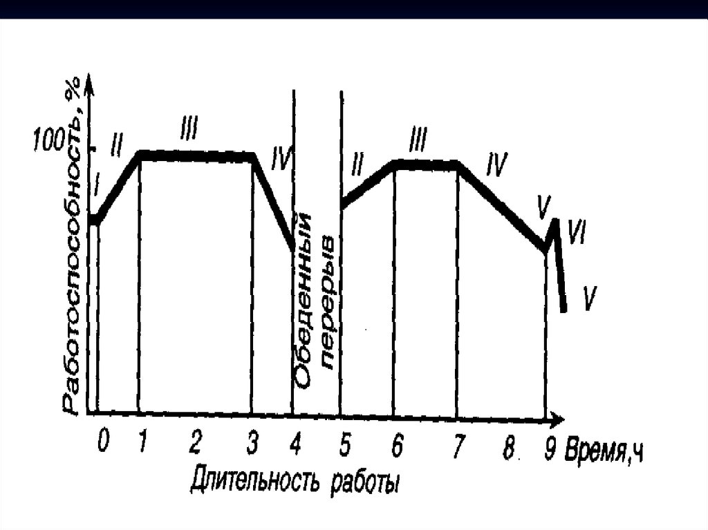 1 стадия – стадия врабатываемости, когда в течение 3090 минут работоспособность растет.