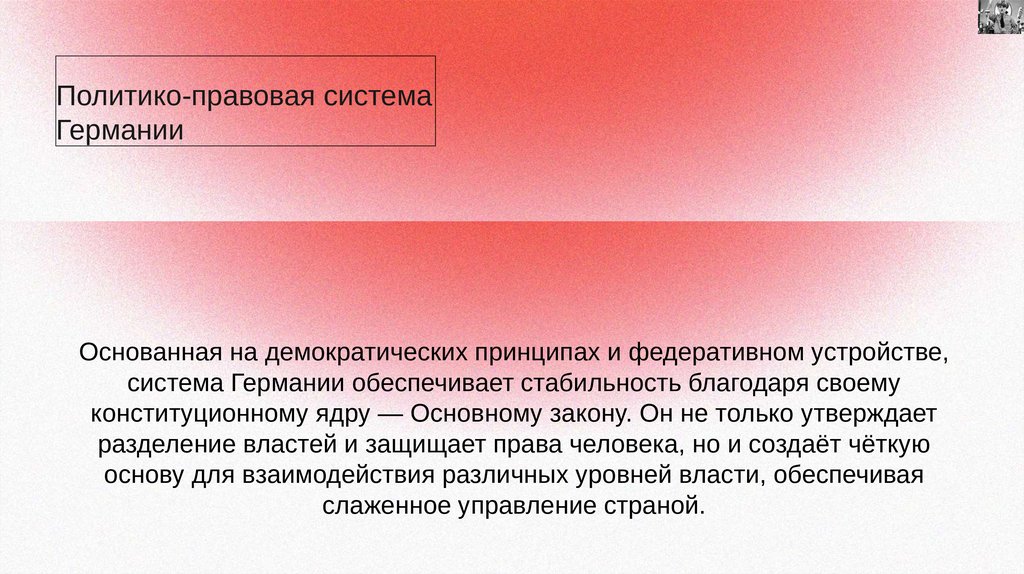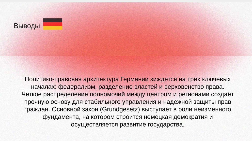 ВыводыПолитико-правовая архитектура Германии зиждется на трёх ключевых