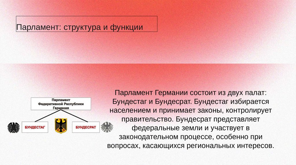 Парламент: структура и функцииПарламент Германии состоит из двух палат: