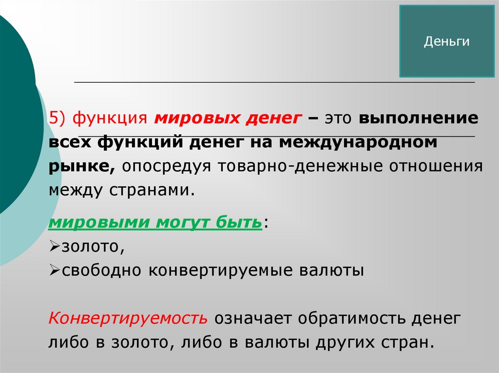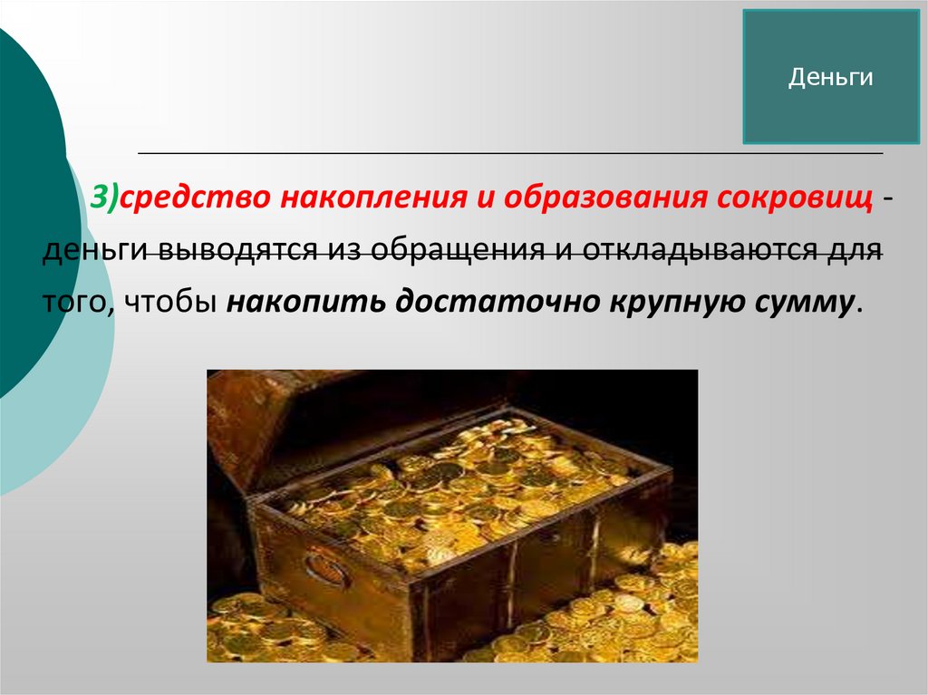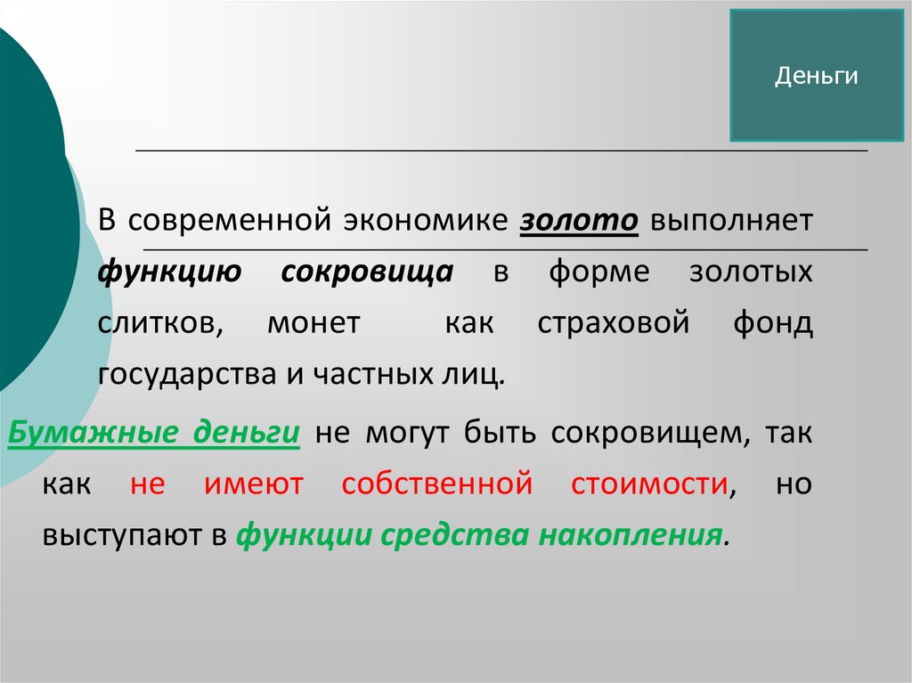 денег как сокровища и как мировых денег;