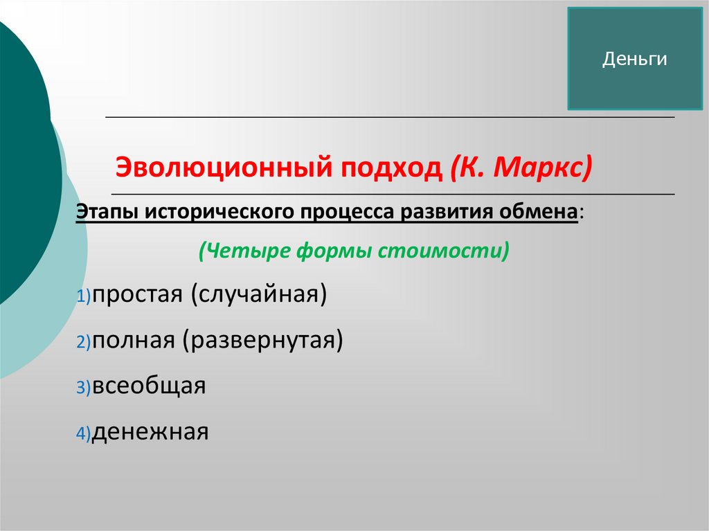 ДеньгиЭволюционный подход (К. Маркс)