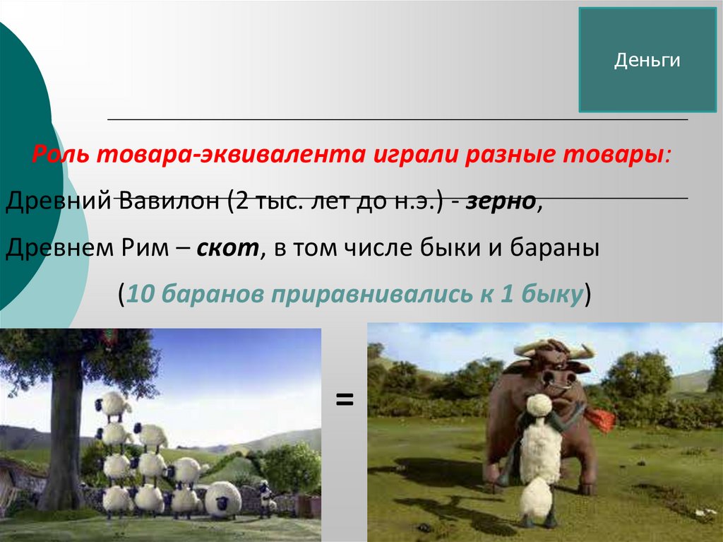 ДеньгиРоль товара-эквивалента играли разные товары: