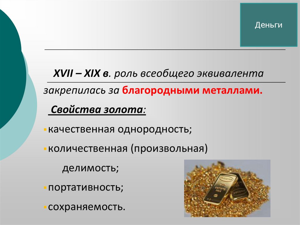 ДеньгиXVII – XIX в. роль всеобщего эквивалента