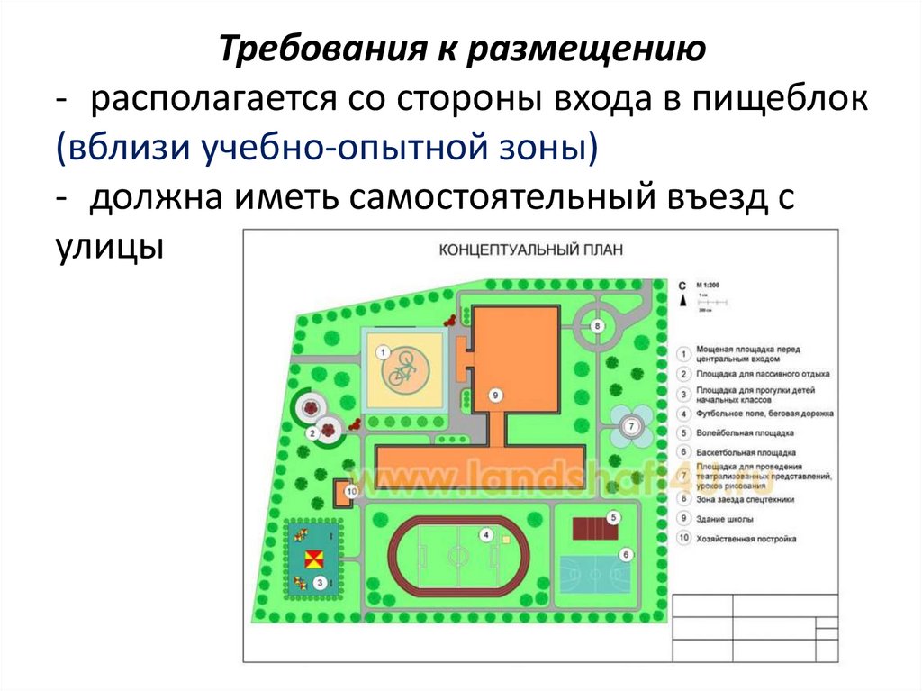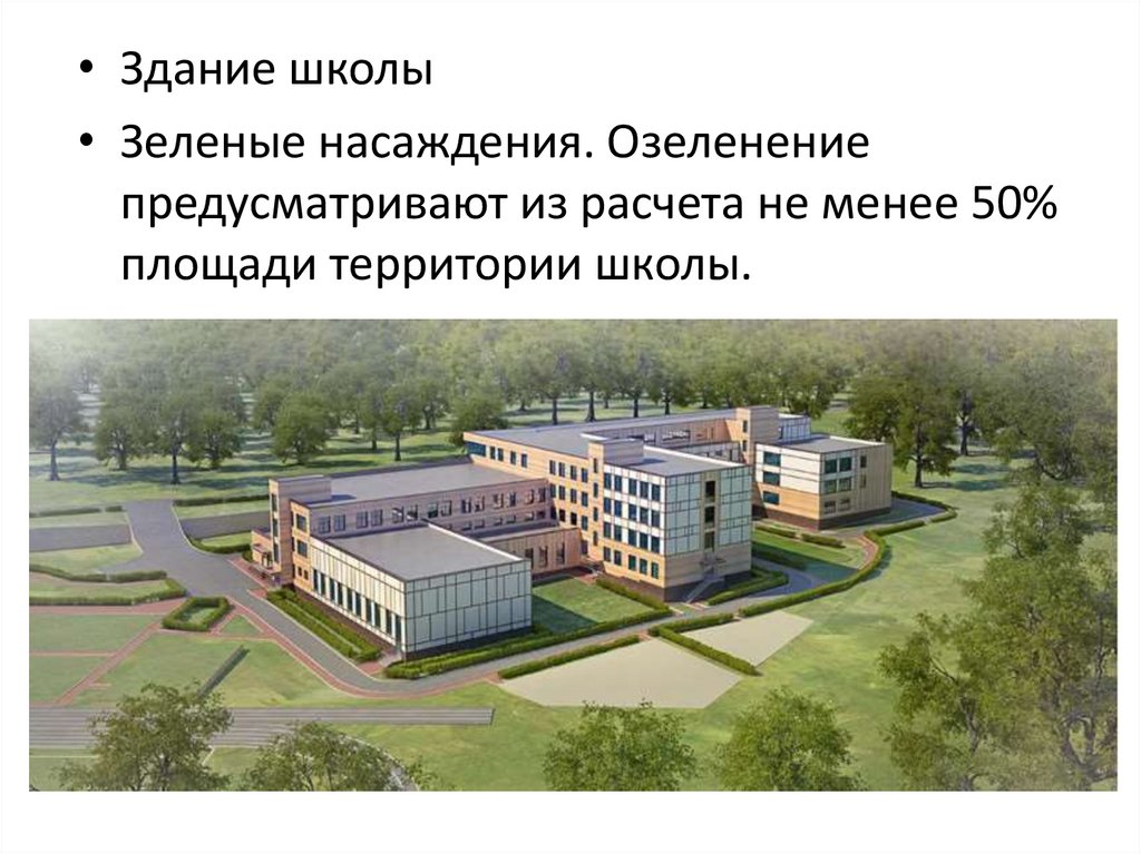 • Здание школы• Зеленые насаждения. Озеленение