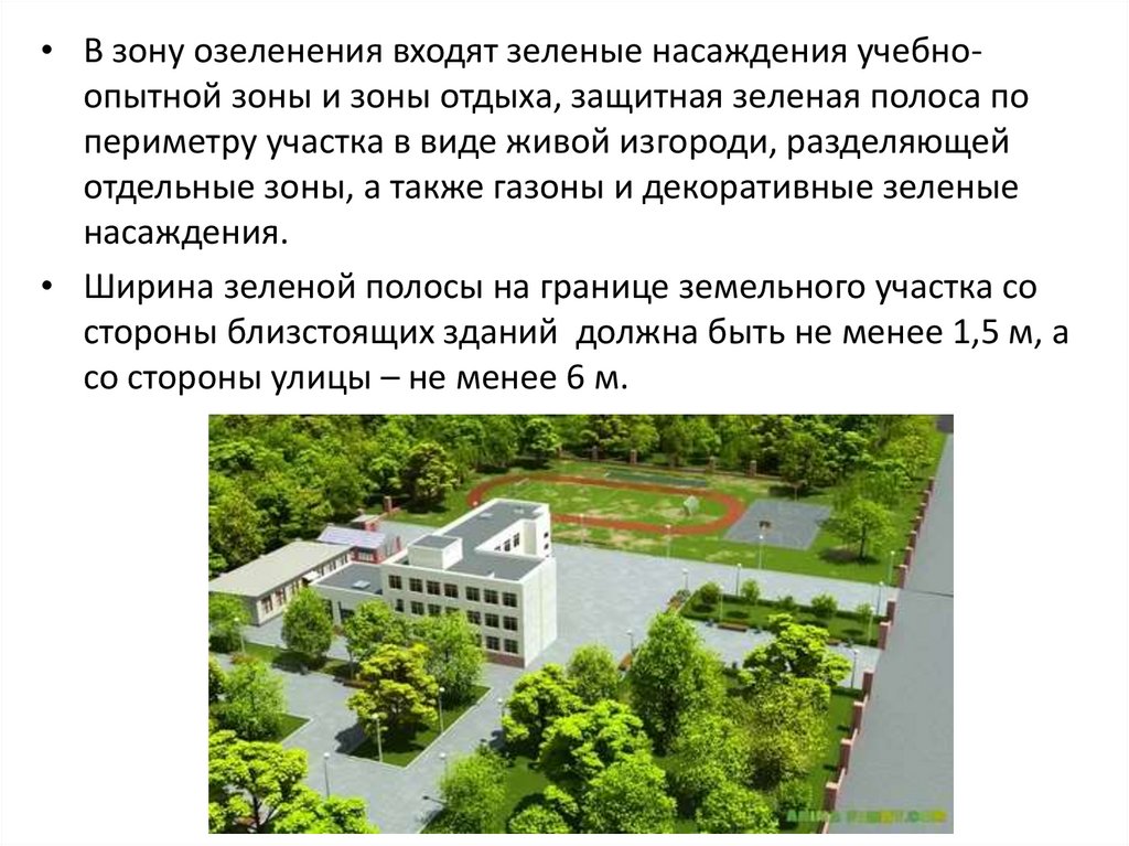 • В зону озеленения входят зеленые насаждения учебноопытной зоны и зоны отдыха, защитная зеленая полоса попериметру участка в виде живой изгороди, разделяющей