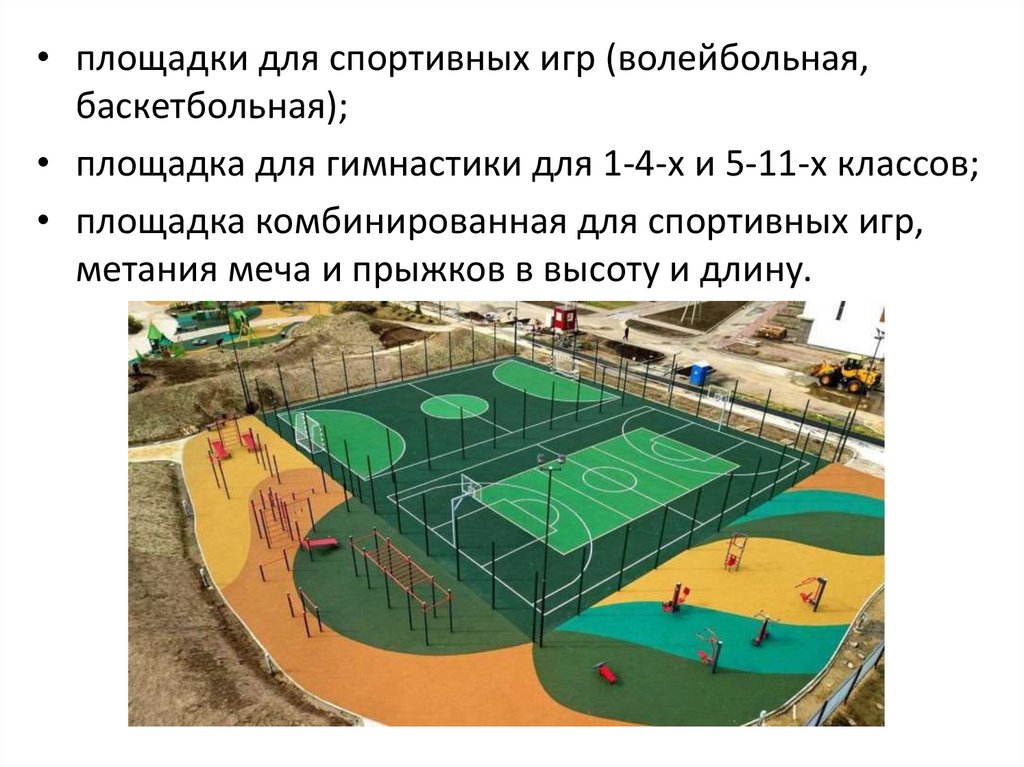 • школьный стадион с беговой дорожкой;• комбинированное поле для футбола и ручного
