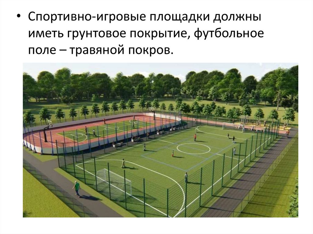 • Спортивно-игровые площадки должныиметь грунтовое покрытие, футбольное
