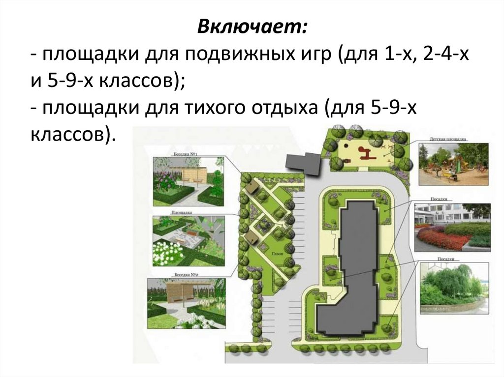 Включает:- площадки для подвижных игр (для 1-х, 2-4-х
