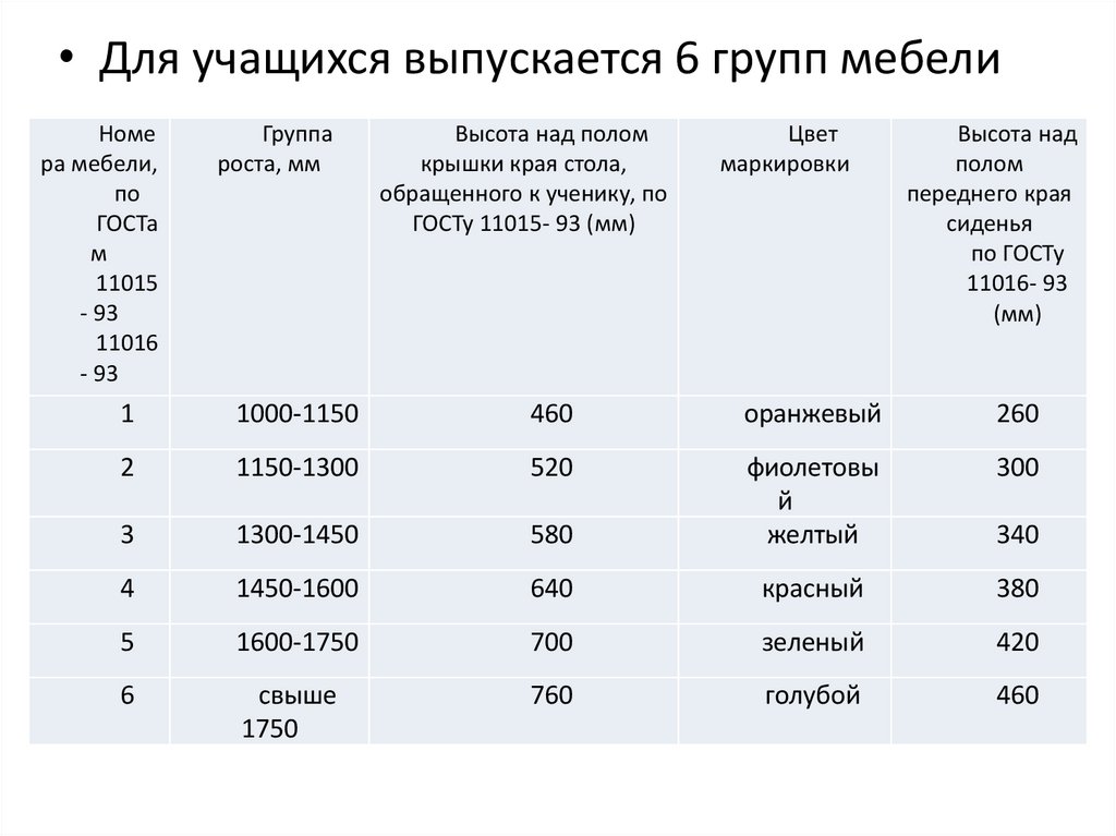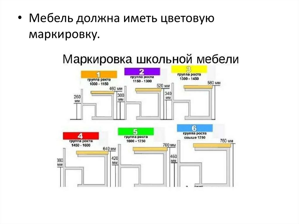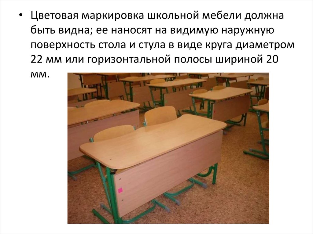 • Цветовая маркировка школьной мебели должнабыть видна; ее наносят на видимую наружную