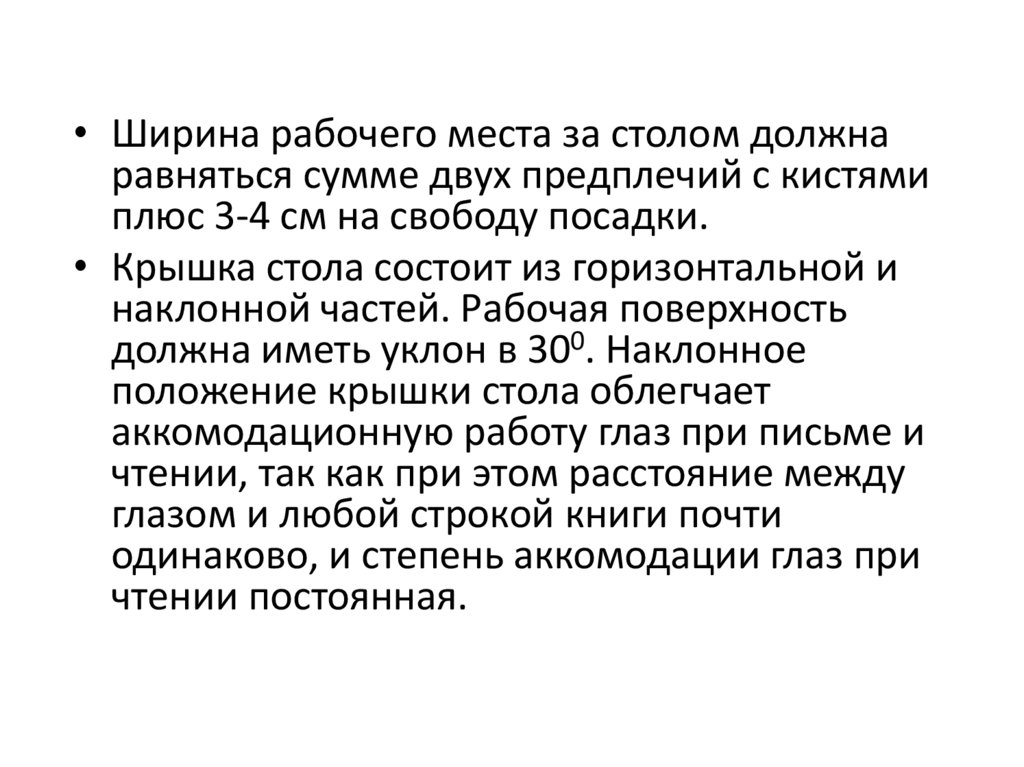 • Ширина рабочего места за столом должнаравняться сумме двух предплечий с кистями