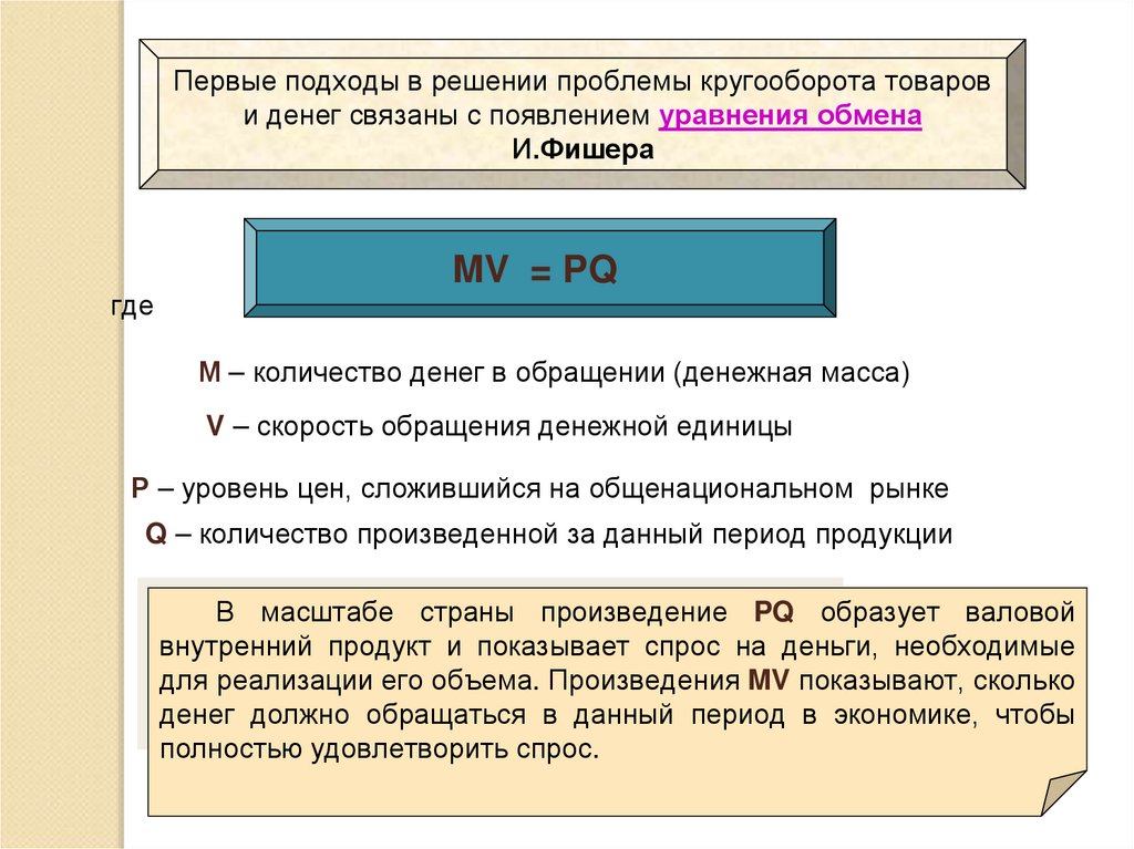 Первые подходы в решении проблемы кругооборота товарови денег связаны с появлением уравнения обмена