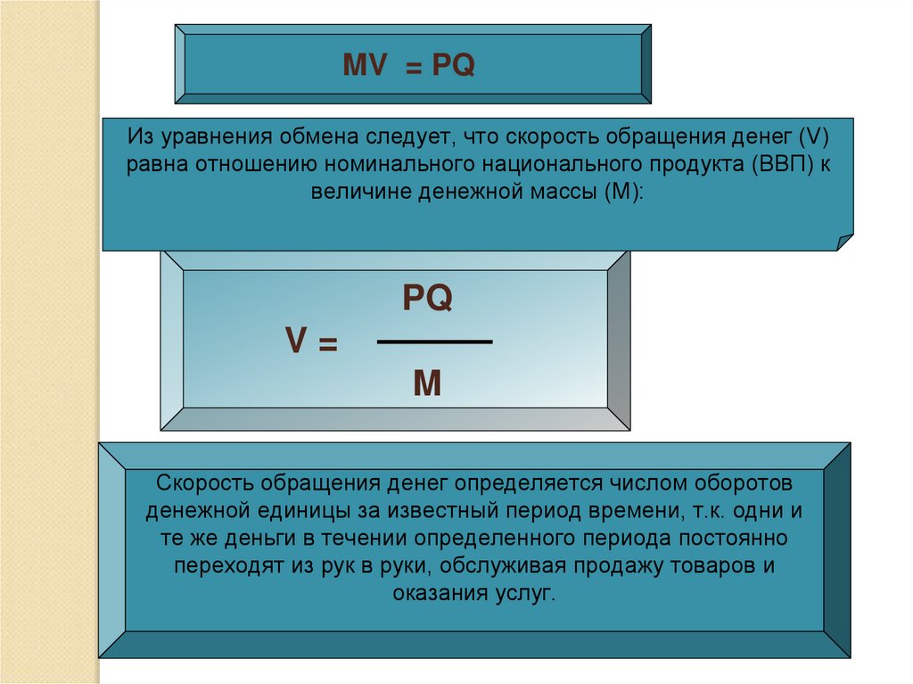 MV = PQИз уравнения обмена следует, что скорость обращения денег (V)