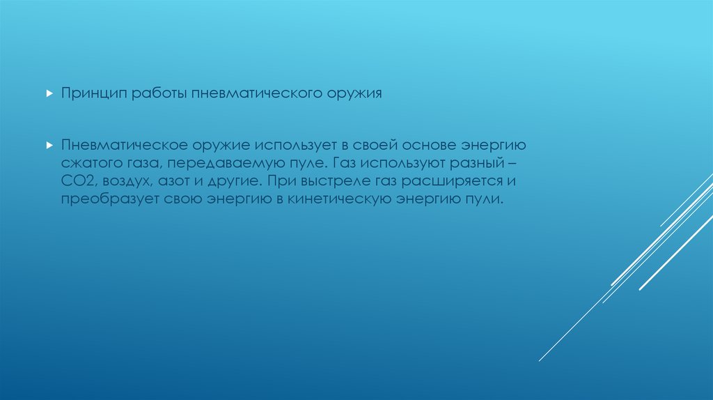 Принцип работы пневматического оружияПневматическое оружие использует в своей основе энергию