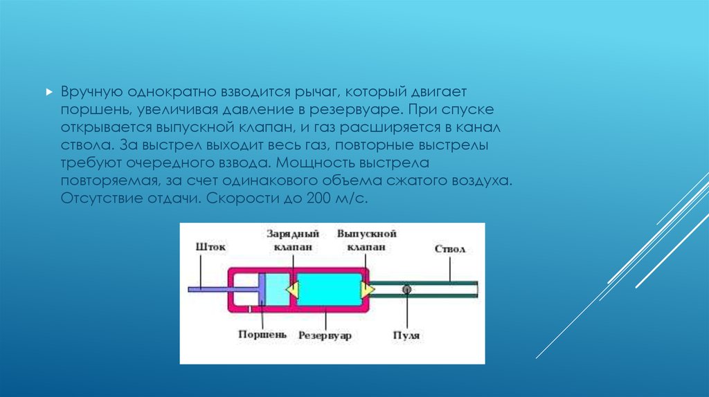 Вручную однократно взводится рычаг, который двигаетпоршень, увеличивая давление в резервуаре. При спуске