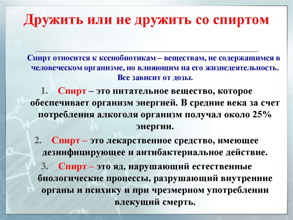 Дружить или не дружить со спиртомСпирт относится к ксенобиотикам – веществам, не содержащимся в
