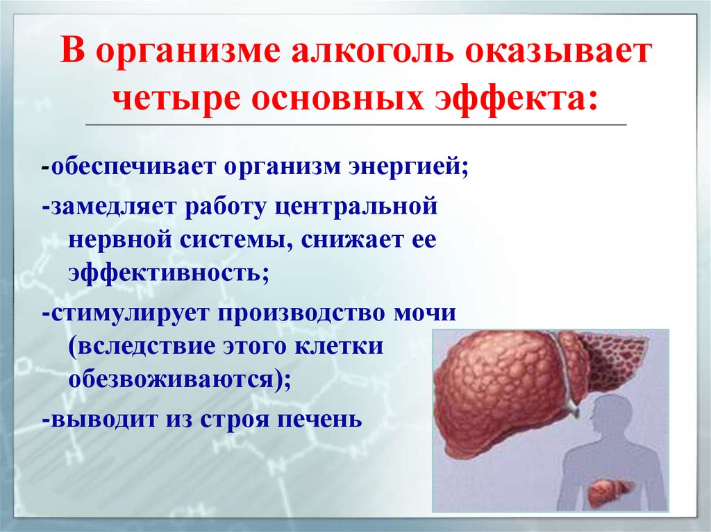 В организме алкоголь оказываетчетыре основных эффекта: