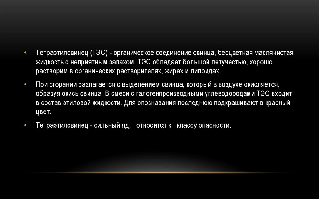 Тетраэтилсвинец (ТЭС) - органическое соединение свинца, бесцветная маслянистая