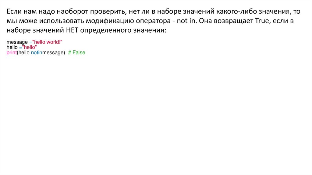 Если нам надо наоборот проверить, нет ли в наборе значений какого-либо значения, томы може использовать модификацию оператора - not in. Она возвращает True, если в