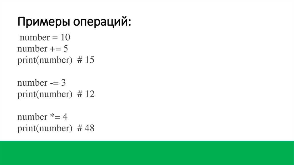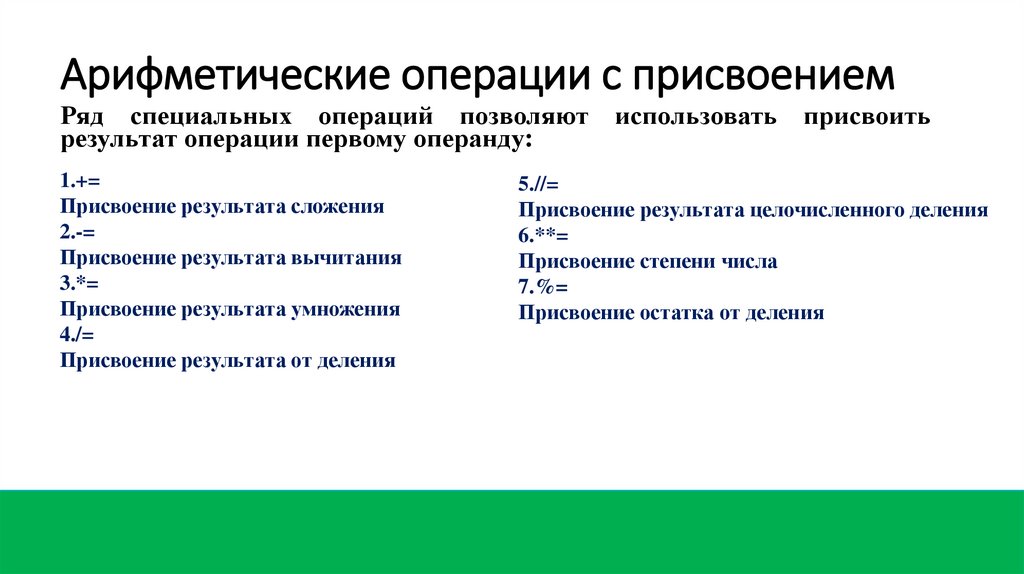 Арифметические операции с присвоениемРяд специальных операций позволяют использовать присвоить