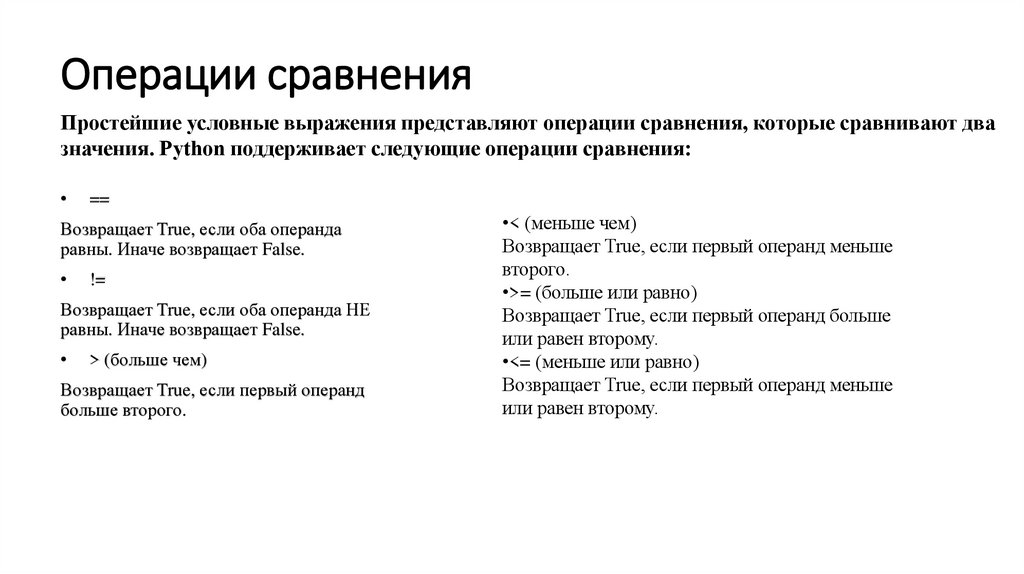 Операции сравненияПростейшие условные выражения представляют операции сравнения, которые сравнивают два