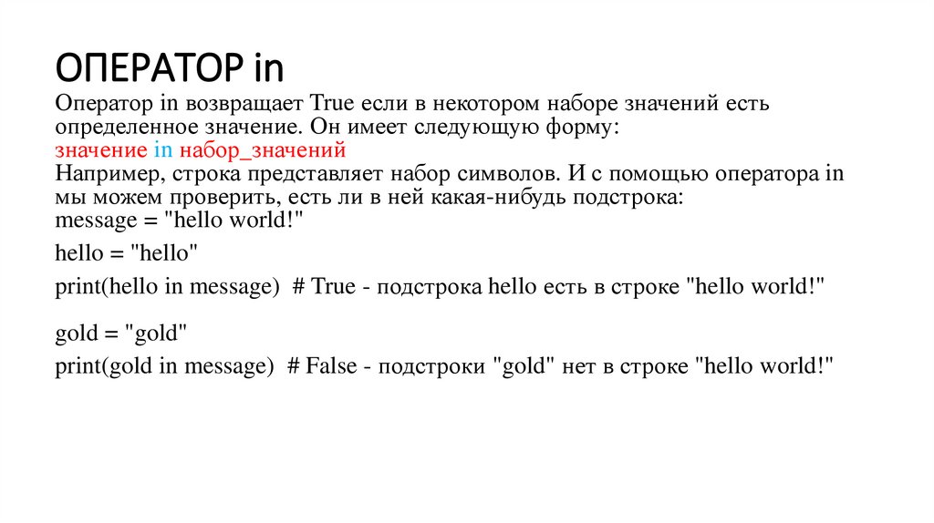 print(gold in message) # False - подстроки "gold" нет в строке "hello world!"