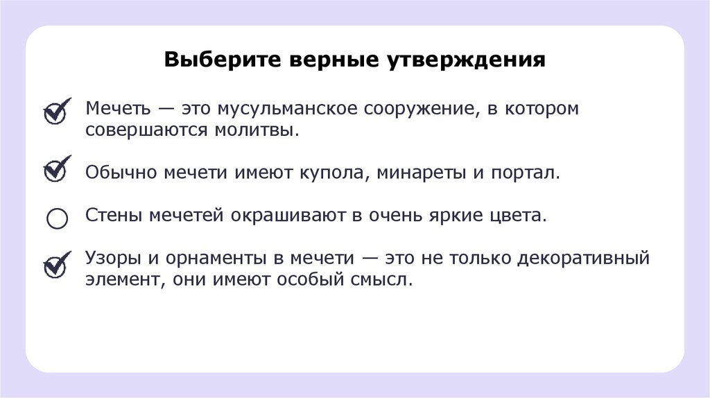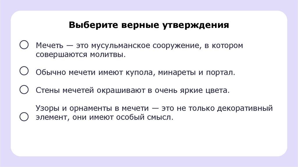 Выберите верные утвержденияМечеть — это мусульманское сооружение, в котором