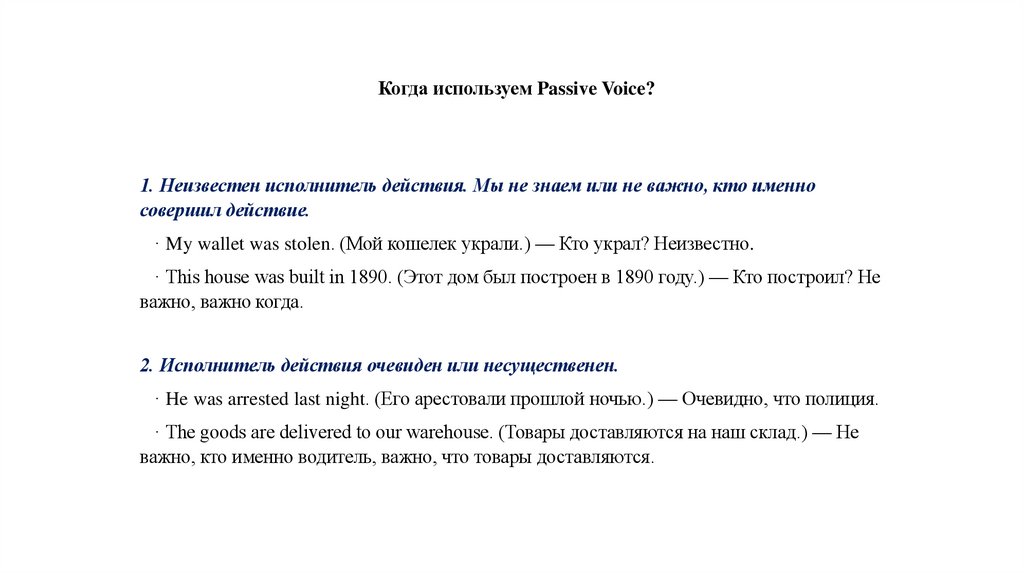 Когда используем Passive Voice?1. Неизвестен исполнитель действия. Мы не знаем или не важно, кто именно