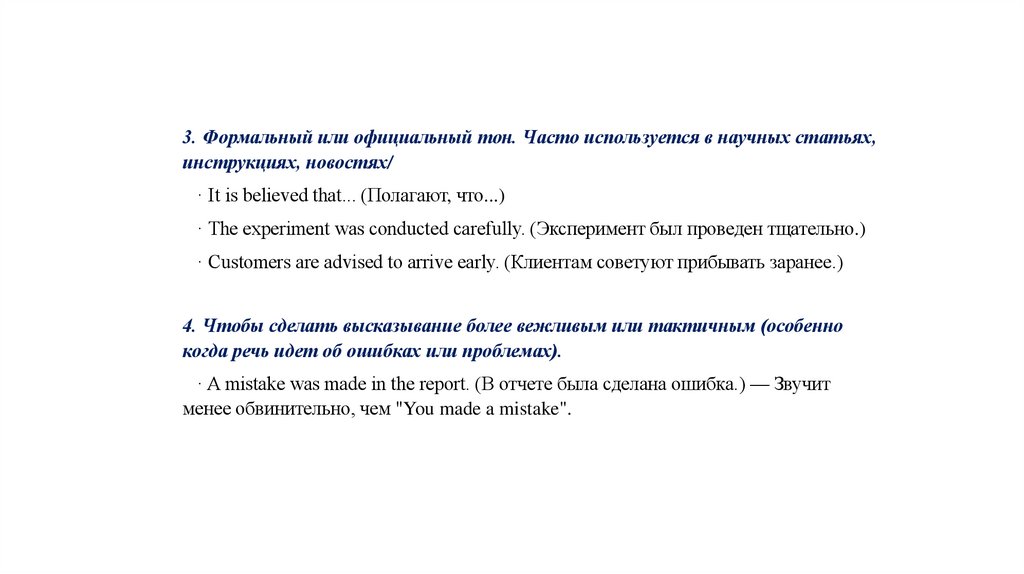 3. Формальный или официальный тон. Часто используется в научных статьях,инструкциях, новостях/
