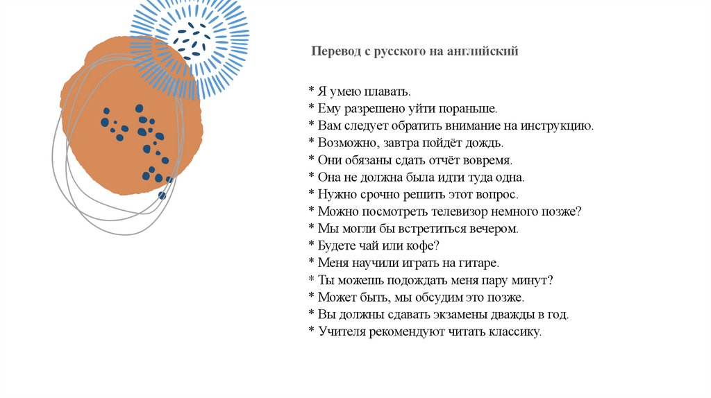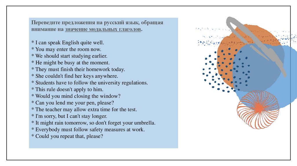 Переведите предложения на русский язык, обращаявнимание на значение модальных глаголов.