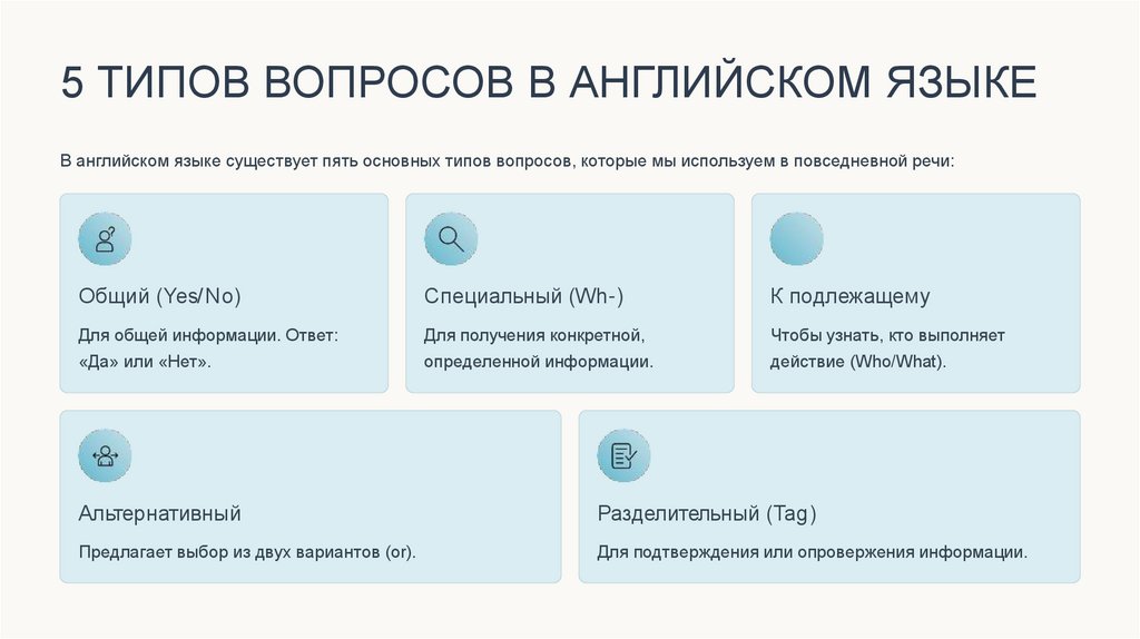 5 ТИПОВ ВОПРОСОВ В АНГЛИЙСКОМ ЯЗЫКЕВ английском языке существует пять основных типов вопросов, которые мы используем в повседневной речи: