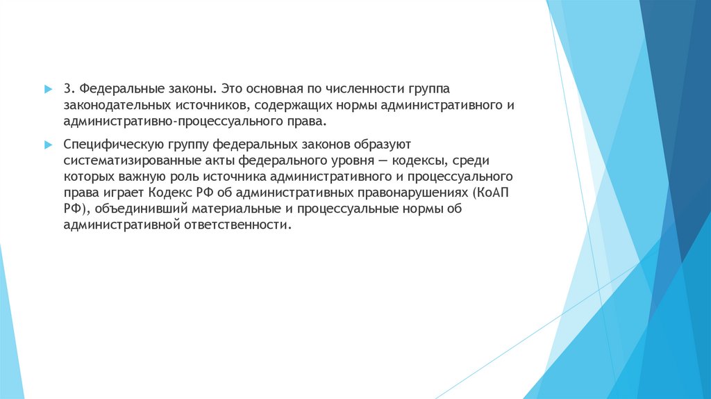 3. Федеральные законы. Это основная по численности группазаконодательных источников, содержащих нормы административного и