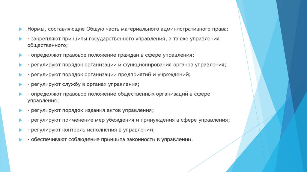 Нормы, составляющие Общую часть материального административного права:- закрепляют принципы государственного управления, а также управления