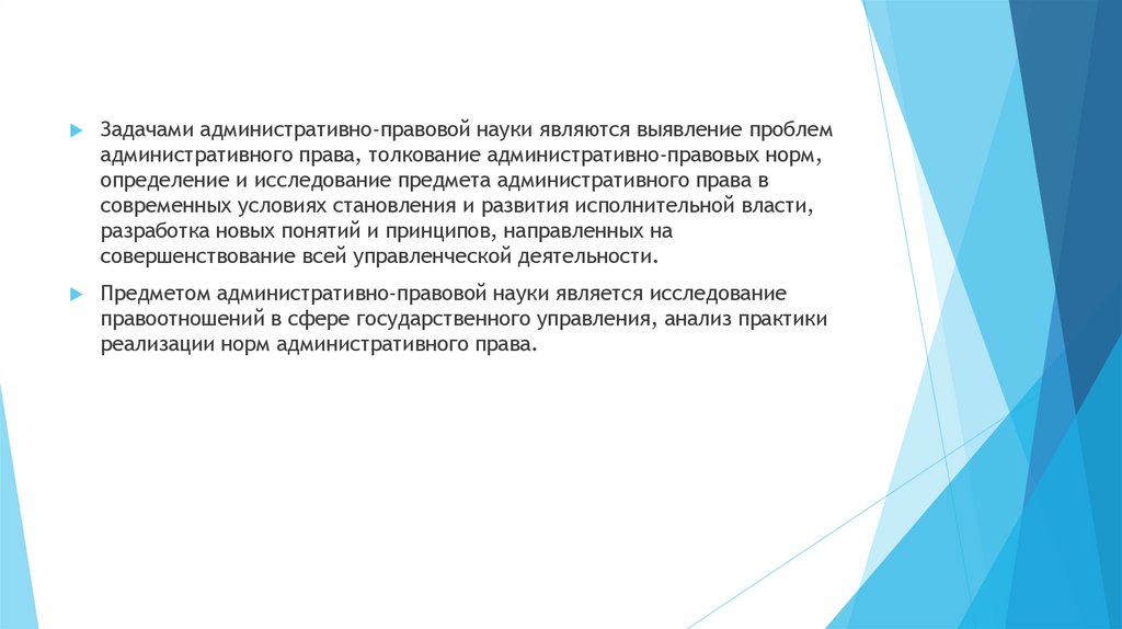 Задачами административно-правовой науки являются выявление проблемадминистративного права, толкование административно-правовых норм,