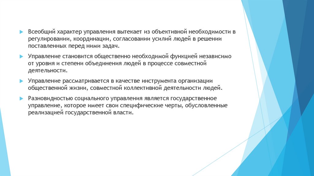 Всеобщий характер управления вытекает из объективной необходимости врегулировании, координации, согласовании усилий людей в решении