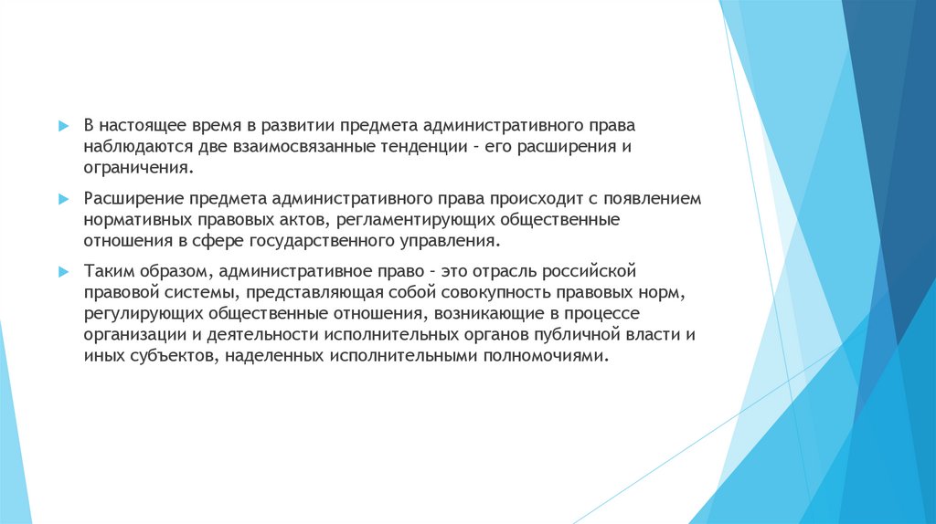В настоящее время в развитии предмета административного праванаблюдаются две взаимосвязанные тенденции – его расширения и