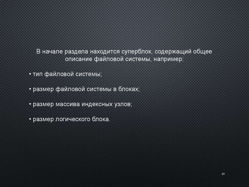 В начале раздела находится суперблок, содержащий общееописание файловой системы, например: